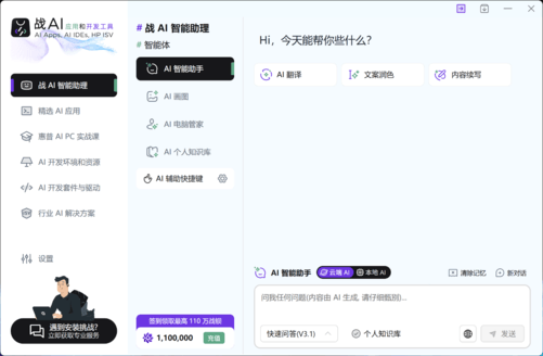 战AI应用和开发工具的功能极尽全面,可以这么说,几乎所有的AI需求,都能够在这里得到解决。其提供了包含AI智能助手(云端/本地多模态大模型)、AI画图、AI电脑管家、AI个人知识库等诸多实用的AI功能,同时还精选数十款AI应用,并考虑到商用场景下的数据安全问题,与部分头部AI应用合作,比如战AIPPT,让计算过程在本地进行。甚至还上线了AIPC实战课,以及为AI开发提供了配套的资源。