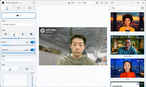 PolyCameraPro+PolyStudio构成的完整线上会议解决方案,在功能方面提供了包括背景虚化、人物追踪、美颜、滤镜、降噪等常用功能,同时还有别出心裁的自定义场景功能,可以让会议更加高效。而且几乎所有功能均在内置的GPU和NPU上进行计算,能效更出色,进一步降低CPU的运行负担。