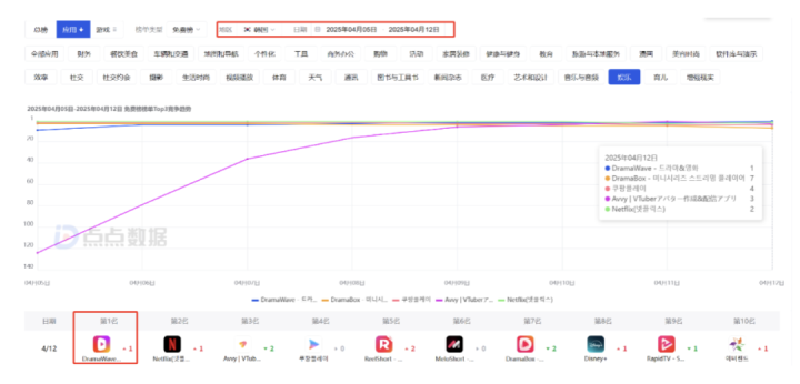 DramaWave韩国GooglePlay娱乐应用榜排名情况