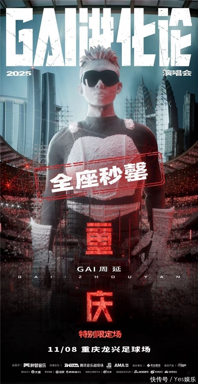 此前,《GAI进化论》巡演在2024至2025年间已走过十站万人体育馆,场场爆满,积累下超高口碑,为这次体育场级别的突破奠定坚实基础。从万人体育馆到五万人体育场,GAI用一场场登峰造极的进化演出展现着内在的巨大能量,《GAI进化论》体育场演唱会门票两次开票全部秒售罄,售票后官宣了此次的演出嘉宾有王鹤棣、C-BLOCK(盛宇、刘聪、功夫胖)、布瑞吉、威尔,强大阵容令歌迷无比惊喜,高呼票价超值!开演前夕重庆站GAI痛楼前人山人海,粉丝提前开唱狂欢,演出过程中#GAI演唱会##GAI体育场统治级上座率##GAI的嘉宾是王鹤棣#等话题冲上微博热搜,歌迷表示“种种迹象显示,这个GAI周延,越大的舞台表现越好,体育场的声场更开阔,效果比体育馆更好!”粉丝用实际行动证明了GAI的超强票房号召力,也用数据证明了中文说唱具备支撑大型商业演唱会的潜力。GAI则用一场超越性的演出证明:中文说唱已经进入全新的体育场时代。