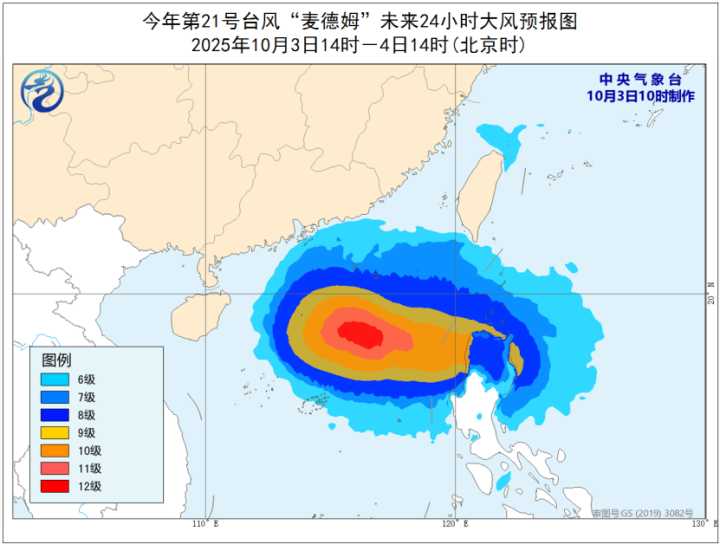 大风预报:3日14时至4日14时,巴士海峡、南海北部和中部海域、黄岩岛附近海域将有6-9级、阵风10-11级的大风,“麦德姆”中心经过的附近海域风力可达10-12级,阵风13-14级。