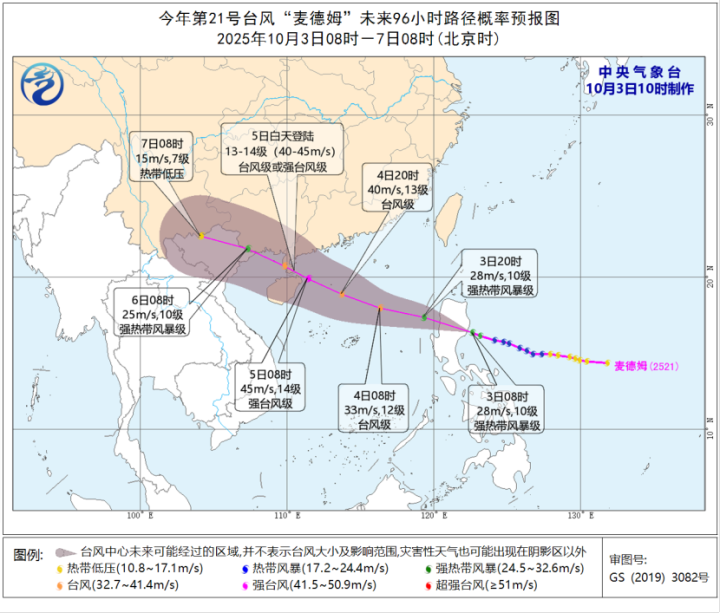 预计,“麦德姆”将以每小时30公里左右的速度向西偏北方向移动,将于今天白天穿过菲律宾吕宋岛,之后移入南海东部海面,逐渐向广东西部到海南岛东部一带沿海靠近,强度逐渐增强,最强可达强台风级(14-15级,42-48米/秒),将于5日白天在上述沿海登陆(台风级或强台风级,13-14级,40-45米/秒),登陆后强度逐渐减弱。